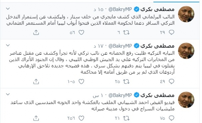 وكتب بكري عبر تغريدة له على "تويتر" رصدها" المشهد العربي":"النيابة التركية طلبت رفع الحصانة عن نائب تركي لأنه تجرأ وكشف عن مقتل عناصر من المخابرات التركية علي يد الجيش الوطني الليبي".