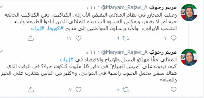 وكتبت رجوي عبر تغريدة لها على "تويتر" رصدها " المشهد العربي":"وصلت المجازر في نظام الملالي البغيض الآن إلى الكتاكيت. دفن الكتاكيت الجائعة حية أمر لا يغتفر، ويعكس القسوة الشديدة للملالي الذين أبادوا الطبيعة وأبناء الشعب الإيراني، والآن يرسلون المواطنين إلى مذبح كورونا".