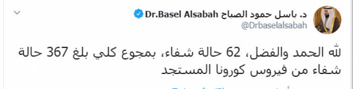 وكتب الصباح عبر تغريدة له على "تويتر" رصدها " المشهد العربي":" لله الحمد والفضل، 62 حالة شفاء، بمجوع كلي بلغ 367 حالة شفاء من فيروس كورونا المستجد".