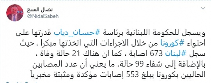 وقال في تغريدة عبر "تويتر" رصدها "المشهد العربي": "يسجل للحكومة اللبنانية برئاسة حسان دياب قدرتها على احتواء كورونا من خلال الإجراءات التي اتخذتها مبكرًا، حيث سجل لبنان 673 إصابة، كما أن هناك 21 حالة وفاة، بالإضافة إلى شفاء 99 حالة، ما يعني أن عدد المصابين الحاليين بكورونا يبلغ 553 إصابات مؤكدة ومثبتة مخبرياً".