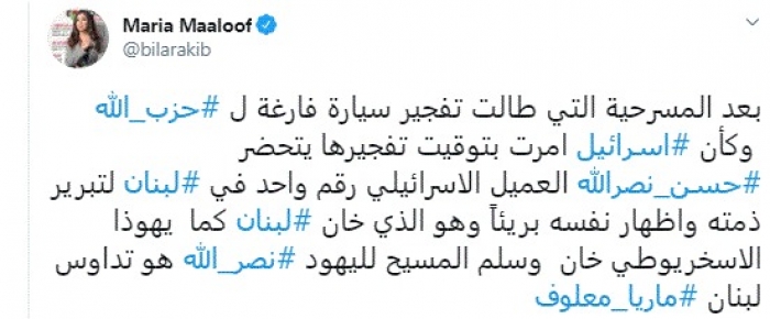 وقالت في تغريدة عبر "تويتر" رصدها "المشهد العربي": "بعد المسرحية التي طالت تفجير سيارة فارغة لحزب الله وكأن إسرائيل أمرت بتوقيت تفجيرها يتحضر حسن نصرالله العميل الإسرائيلي رقم واحد في لبنان".