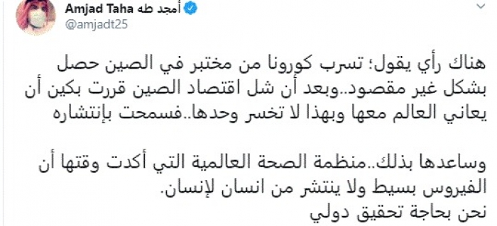 وقال في تغريدة عبر "تويتر" رصدها "المشهد العربي": "هناك رأي يقول؛ تسرب كورونا من مختبر في الصين حصل بشكل غير مقصود..وبعد أن شل اقتصاد الصين قررت بكين أن يعاني العالم معها وبهذا لا تخسر وحدها.. فسمحت بإنتشاره وساعدها بذلك..منظمة الصحة العالمية التي أكدت وقتها أن الفيروس بسيط ولا ينتشر من إنسان لإنسان. نحن بحاجة تحقيق دولي".