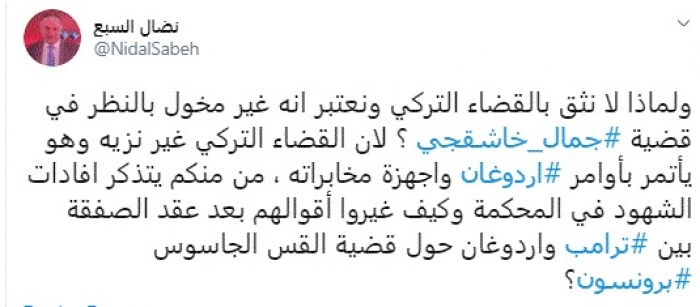 وكتب في تغريدة عبر "تويتر" رصدها "المشهد العربي": "ولماذا لا نثق بالقضاء التركي ونعتبر أنه غير مخول بالنظر في قضية جمال خاشقجي؟ لأن القضاء التركي غير نزيه وهو يأتمر بأوامر أردوغان وأجهزة مخابراته".