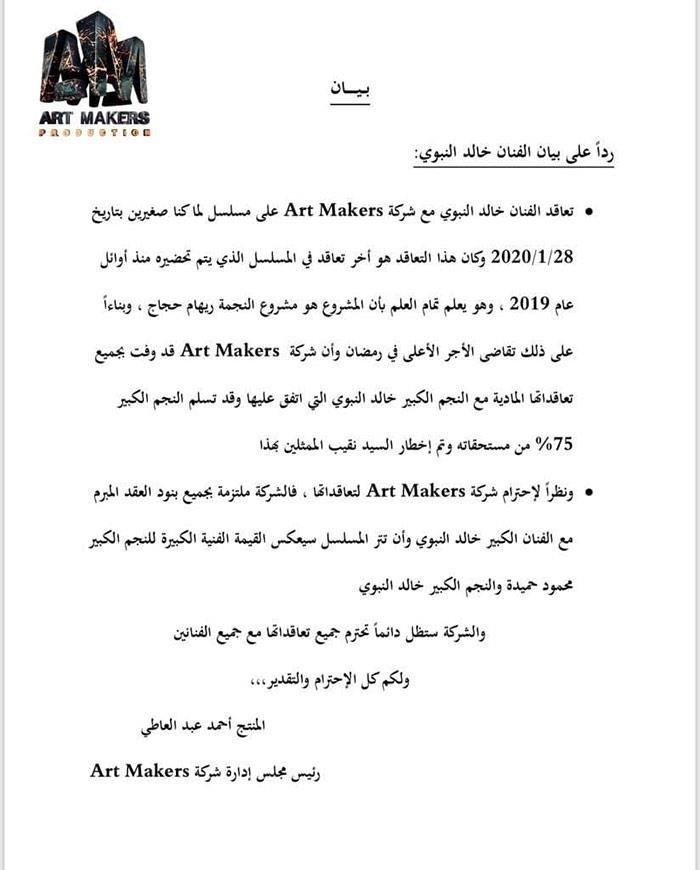 وأضاف البيان: "وبناء على ذلك، تقاضى الأجر الأعلى في رمضان وأن شركة art makers قد وفت بجميع تعاقداتها المادية مع النجم الكبير خالد النبوي التي اتفق عليها وقد تسلم النجم الكبير 75 % من مستحقاته وتم إخطار السيد النقيب بهذا".