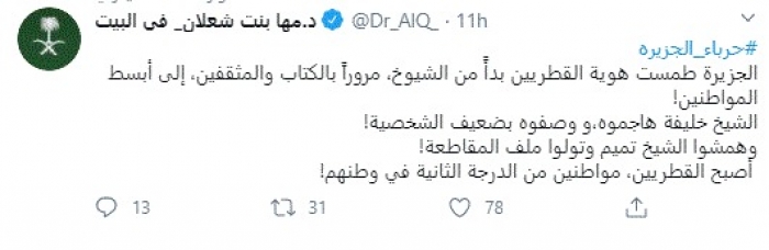 وقالت في تغريدة عبر "تويتر" رصدها "المشهد العربي": "الجزيرة طمست هوية القطريين بدأً من الشيوخ، مروراً بالكتاب والمثقفين، إلى أبسط المواطنين".