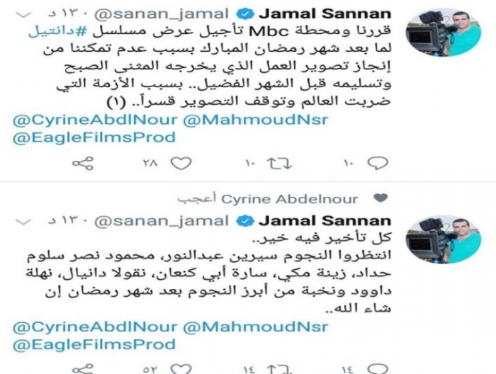 وكتب "سنان" عبر حسابه على تويتر: "قررنا ومحطة mbc تأجيل عرض مسلسل دانتيل لما بعد شهر رمضان المبارك، بسبب عدم تمكننا من إنجاز تصوير العمل الذي يخرجه المثنى الصبح وتسليمه قبل الشهر الفضيل بسبب الأزمة التي ضربت العالم وتوقف التصوير قسراً".