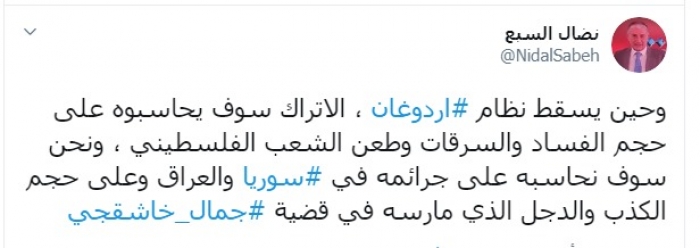 وكتب السبع عبر تغريدة له على "تويتر" رصدها" المشهد العربي":"وحين يسقط نظام أردوغان ، الأتراك سوف يحاسبوه على حجم الفساد والسرقات وطعن الشعب الفلسطيني".