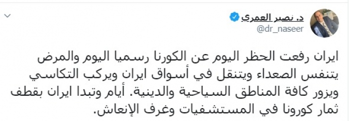وكتب العمري عبر تغريدة له على "تويتر" رصدها " المشهد العربي":"إيران رفعت الحظر اليوم عن الكورونا رسميا اليوم والمرض يتنفس الصعداء ويتنقل في أسواق ايران ويركب التكاسي ويزور كافة المناطق السياحية والدينية".
