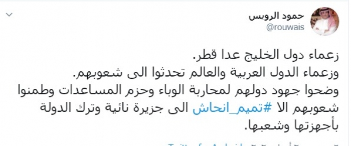 وكتب الرويس عبر تغريدة له على "تويتر" رصدها" المشهد العربي":"زعماء دول الخليج عدا قطر،وزعماء الدول العربية والعالم تحدثوا إلى شعوبهم".