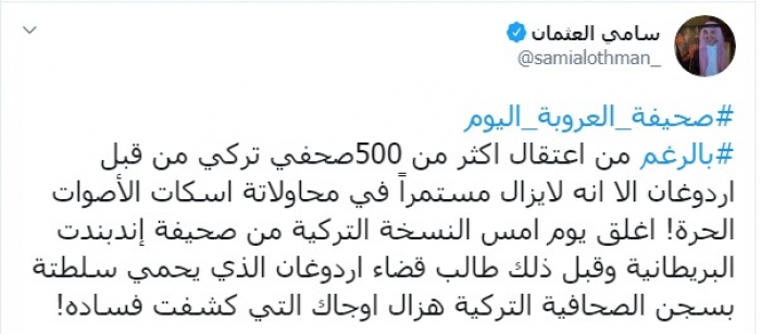 وكتب العثمان عبر تغريدة له على "تويتر" رصدها " المشهد العربي":"بالرغم من اعتقال أكثر من 500صحفي تركي من قبل أردوغان إلا انه لا يزال مستمراً في محاولاته إسكات الأصوات الحرة".