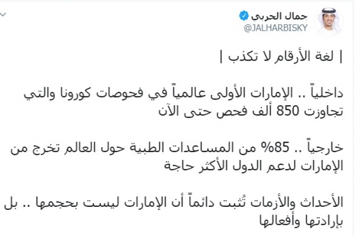 وكتب الحربي عبر تغريدة له على "تويتر" رصدها " المشهد العربي":"لغة الأرقام لا تكذب،داخلياً الإمارات الأولى عالمياً في فحوصات كورونا والتي تجاوزت 850 ألف فحص حتى الآن".