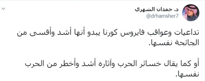 وكتب الشهري عبر تغريدة له على "تويتر" رصدها " المشهد العربي":"تداعيات وعواقب فايروس كورنا يبدو أنها أشد وأقسى من الجائحة نفسها".