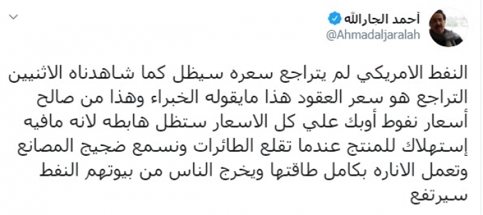 وكتب الجارلله عبر تغريدة على "تويتر" رصدها " المشهد العربي":"النفط الأمريكي لم يتراجع سعره سيظل كما شاهدناه الاثنين التراجع هو سعر العقود هذا ما يقوله الخبراء وهذا من صالح أسعار نفوط أوبك على كل الأسعار ستظل هابطة لأنه ما فيه استهلاك للمنتج".