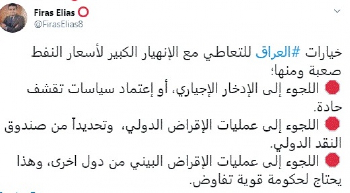 وقال في تغريدة عبر "تويتر" رصدها "المشهد العربي": "خيارات العراق للتعاطي مع الانهيار الكبير لأسعار النفط صعبة ومنها؛ اللجوء إلى الإدخار الإجياري، أو اعتماد سياسات تقشف حادة".