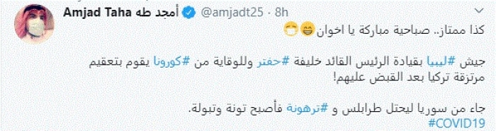 وقال في تغريدة عبر "تويتر" رصدها "المشهد العربي": "جيش ليبيا بقيادة الرئيس القائد خليفة حفتر وللوقاية من كورونا يقوم بتعقيم مرتزقة تركيا بعد القبض عليهم! جاء من سوريا ليحتل طرابلس وترهونة فأصبح تونة وتبولة".