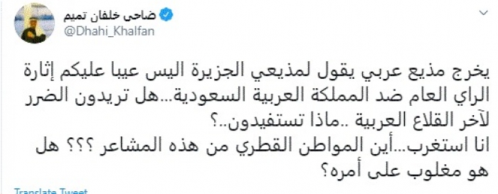 وقال في تغريدة عبر "تويتر" رصدها "المشهد العربي": "يخرج مذيع عربي يقول لمذيعي الجزيرة أليس عيبًا عليكم إثارة الراي العام ضد المملكة العربية السعودية.. هل تريدون الضرر لآخر القلاع العربية..ماذا تستفيدون؟".