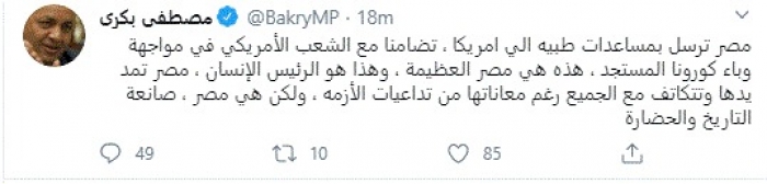 بكري يُعلق على إرسال مصر لمساعدات طبية لأمريكا