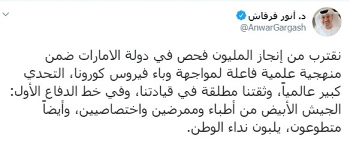 وكتب قرقاش عبر تغريدة له على "تويتر" رصدها " المشهد العربي":"نقترب من إنجاز المليون فحص في دولة الإمارات ضمن منهجية علمية فاعلة لمواجهة وباء فيروس كورونا".