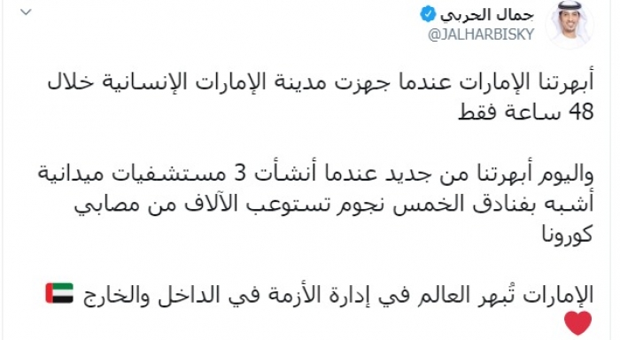 وكتب الحربي عبر تغريدة له على "تويتر" رصدها " المشهد العربي":"أبهرتنا الإمارات عندما جهزت مدينة الإمارات الإنسانية خلال 48 ساعة فقط".