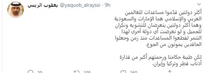 وقال في تغريدة عبر "تويتر" رصدها "المشهد العربي": "أكثر دولتين قدّموا مساعدات للعالمين العربي والإسلامي هما الإمارات والسعودية وهما أكثر دولتين يتعرضان للتشويه ونكران للجميل ولو تعرضت أي دولة أخرى لهذا التنمر لقطعوا المساعدات منذ زمن وجعلوا الحاقدين يموتون من الجوع. لكن طيبة حكامنا ورحمتهم أكبر من قذارة أذناب قطر وتركيا وإيران".