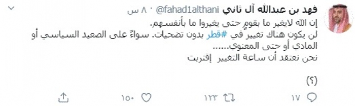 وقال في تغريدة عبر "تويتر" رصدها "المشهد العربي": "إن الله لا يغير ما بقومٍ حتى يغيروا ما بأنفسهم. لن يكون هناك تغيير في قطر بدون تضحيات. سواءً على الصعيد السياسي أو المادي أو حتى المعنوي... نحن نعتقد أن ساعة التغيير اقتربت".