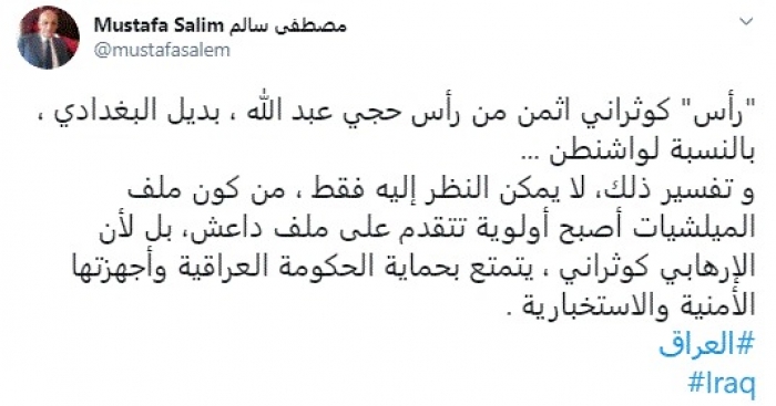وقال في تغريدة عبر "تويتر" رصدها "المشهد العربي": "رأس كوثراني أثمن من رأس حجي عبد الله، بديل البغدادي، بالنسبة لواشنطن.. وتفسير ذلك، لا يمكن النظر إليه فقط ، من كون ملف المليشيات أصبح أولوية تتقدم على ملف داعش، بل لأن الإرهابي كوثراني، يتمتع بحماية الحكومة العراقية وأجهزتها الأمنية والاستخبارية".