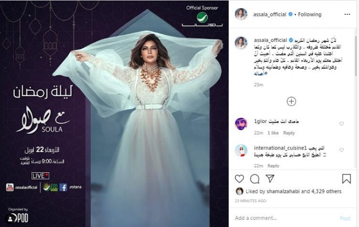 وقالت أصالة: "لأن شهر رمضان الكريم القادم مُختلفة ظروفه، والتقارب ليس كما كان، وكما اعتدنا عليه في السنين التي مضت، أحببت أن أحتفل معكم يوم الأربعاء القادم، كل عام وأنتمّ بخير وعوائلكم بخير، وصحة وعافية وطمأنينة وسلام".