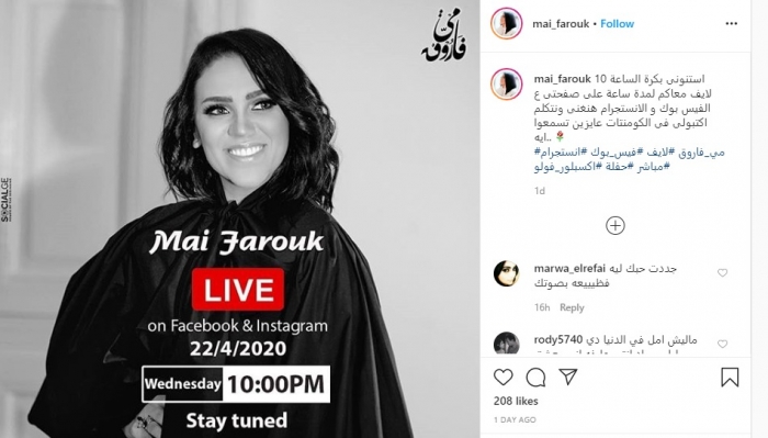 وكتبت مي: "استنونى النهاردة الساعة 10 لايف معاكم لمدة ساعة على صفحتى على الفيسبوك والإنستجرام، هنغنى ونتكلم، اكتبولى فى الكومنتات عايزين تسمعوا إيه".