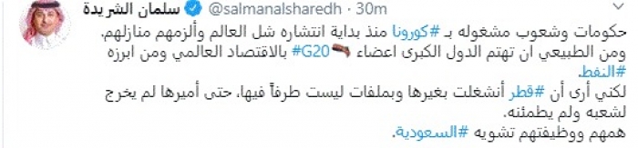 وكتب في تغريدة عبر "تويتر" رصدها "المشهد العربي": "حكومات وشعوب مشغوله بكورونا منذ بداية انتشاره شل العالم وألزمهم منازلهم. ومن الطبيعي أن تهتم الدول الكبرى أعضاء G20 بالاقتصاد العالمي ومن أبرزه النفط".