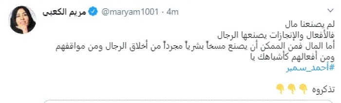 وقالت في تغريدة عبر "تويتر" رصدها "المشهد العربي": "لم يصنعنا مال فالأفعال والإنجازات يصنعها الرجال أما المال فمن الممكن أن يصنع مسخاً بشرياً مجرداً من أخلاق الرجال ومن مواقفهم ومن أفعالهم كأشباهك يا أحمد سمير".