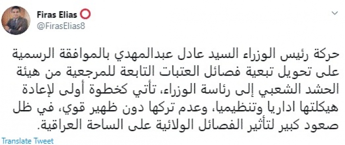 علق الباحث السياسي العراقي فراس إلياس، اليوم، على القرار الأخير لرئيس الوزراء العراقي المستقيل من منصبه عادل عبدالمهدي بشأن تحويل تبعية فصائل العتبات التابعة للمرجعية من هيئة الحشد الشعبي إلى رئاسة الوزراء.