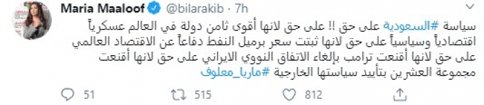 وكتبت في تغريدة عبر "تويتر" رصدها "المشهد العربي": "سياسة السعودية على حق على حق لأنها أقوى ثامن دولة في العالم عسكرياً اقتصادياً وسياسياً على حق لأنها ثبتت سعر برميل النفط دفاعاً عن الاقتصاد العالمي على حق لأنها أقنعت ترامب بإلغاء الاتفاق النووي الايراني على حق لأنها أقنعت مجموعة العشرين بتأييد سياستها الخارجية".