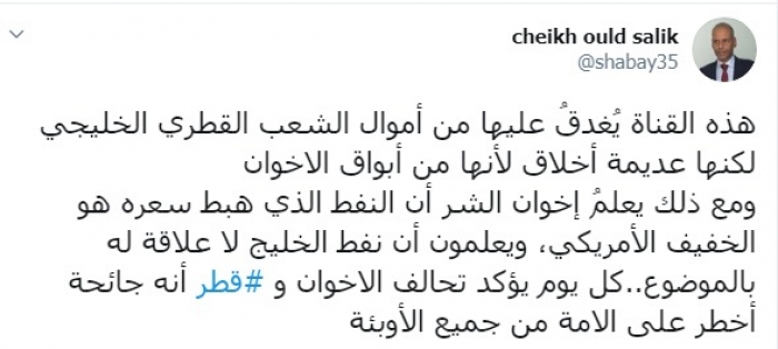وكتب ولد سالك عبر تغريدة له على "تويتر" رصدها " المشهد العربي":"هذه القناة يُغدقُ عليها من أموال الشعب القطري الخليجي لكنها عديمة أخلاق لأنها من أبواق الإخوان".