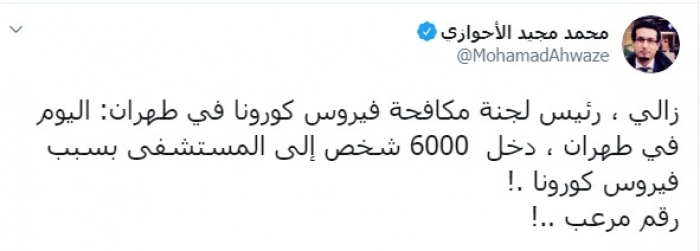 وكتب الأحوازي عبر تغريدة له على "تويتر" رصدها " المشهد العربي":"زالي ، رئيس لجنة مكافحة فيروس كورونا في طهران: اليوم في طهران ، دخل 6000 شخص إلى المستشفى بسبب فيروس كورونا،رقم مرعب".