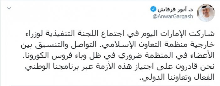 وكتب قرقاش عبر تغريدة له على "تويتر" رصدها " المشهد العربي":"شاركت الإمارات اليوم في اجتماع اللجنة التنفيذية لوزراء خارجية منظمة التعاون الإسلامي، التواصل والتنسيق بين الأعضاء في المنظمة ضروري في ظل وباء فروس الكورونا".