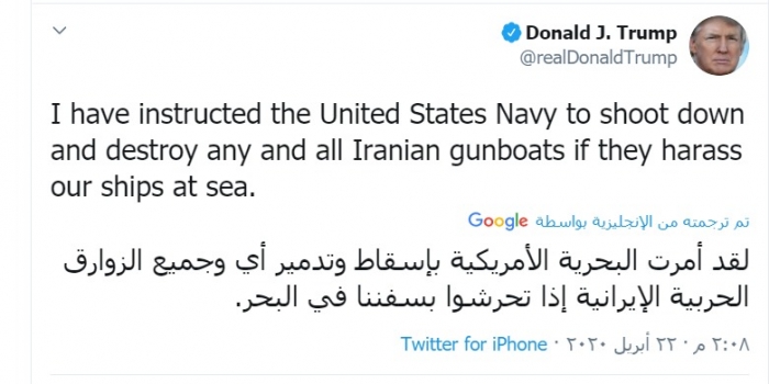 ويأتي تصريح ترامب بعد تحرش بعض الزوارق الإيرانية التابعة للحرس الثوري، بمدمرات أمريكية موجودة بمياه الخليج العربي، ما اعتبره البنتاغون استفزاز سافر وخطير للقوات الأمريكية.