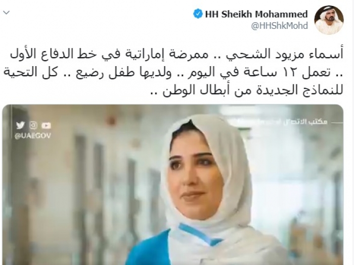 وكتب بن راشد عبر تغريدة له على "تويتر" رصدها " المشهد العربي":"أسماء مزيود الشحي، ممرضة إماراتية في خط الدفاع الأول،تعمل ١٢ ساعة في اليوم، ولديها طفل رضيع، كل التحية للنماذج الجديدة من أبطال الوطن".