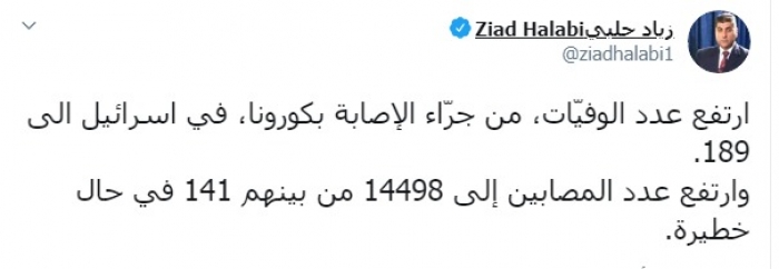 وقال في تغريدة له عبر "تويتر" رصدها "المشهد العربي":ارتفع عدد الوفيّات، من جرّاء الإصابة بكورونا، في إسرائيل إلى 189،وارتفع عدد المصابين إلى 14498 من بينهم 141 في حال خطيرة".