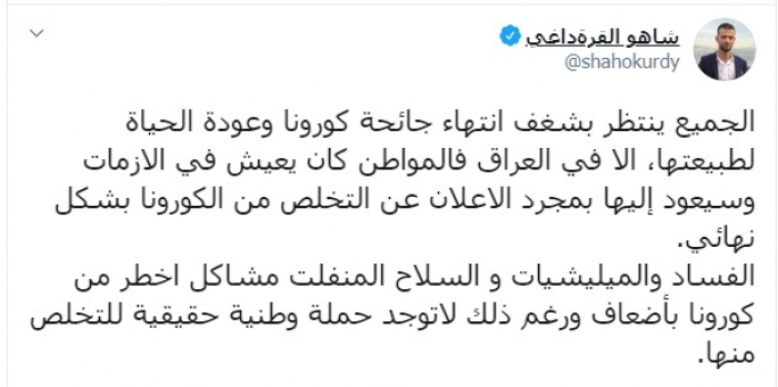 وكتب عبر تغريدة له على "تويتر" رصدها " المشهد العربي":"الجميع ينتظر بشغف انتهاء جائحة كورونا وعودة الحياة لطبيعتها، إلا في العراق فالمواطن كان يعيش في الأزمات وسيعود إليها بمجرد الإعلان عن التخلص من الكورونا بشكل نهائي".