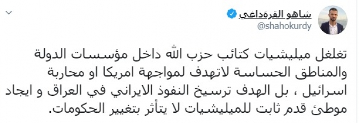 وكتب عبر تغريدة له على "تويتر" رصدها " المشهد العربي":"تغلغل ميليشيات كتائب حزب الله داخل مؤسسات الدولة والمناطق الحساسة لا تهدف لمواجهة أمريكا أو محاربة إسرائيل".