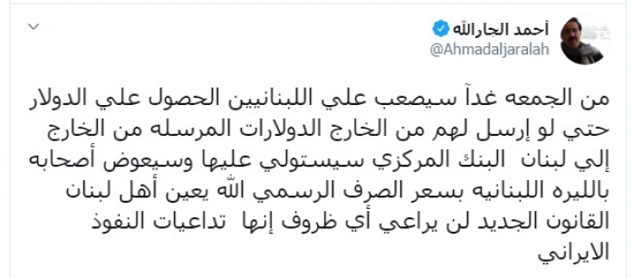 وكتب الجارالله عبر تغريدة له على "تويتر" رصدها " المشهد العربي":"من الجمعة غدا سيصعب على اللبنانيين الحصول على الدولار حتى لو أرسل لهم من الخارج الدولارات المرسلة من الخارج إلي لبنان البنك المركزي سيستولي عليها وسيعوض أصحابه بالليرة اللبنانية بسعر الصرف الرسمي".