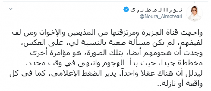 وكتبت المطيري عبر تغريدة لها على "تويتر" رصدها " المشهد العربي":"واجهت قناة الجزيرة ومرتزقتها من المذيعين والإخوان ومن لف لفيفهم، لم تكن مسألة صعبة بالنسبة لي".