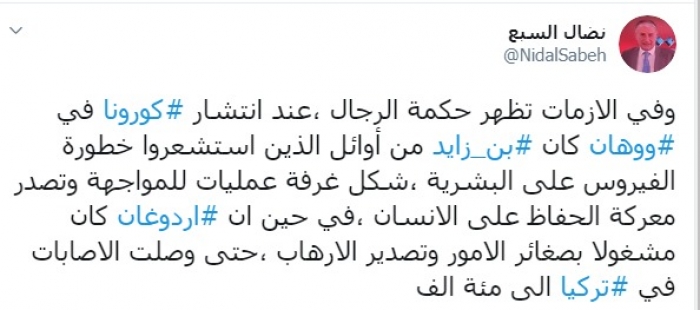 أكد المحلل السياسي اللبناني نضال السبع، اليوم الخميس، أن ولي عهد أبو ظبي محمد بن زايد يواجه كورونا عالميا، فيما يصدر الرئيس التركي رجب طيب أردوغان الإرهاب للعالم.