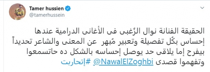 وعلق عبر حسابه الرسمي بموقع تويتر: "الحقيقة الفنانة نوال الزغبي في الأغاني الدرامية عندها إحساس بكل تفصيلة، وتعبير مبهر عن المعنى، والشاعر تحديدا بيفرح لما يلاقي حد يوصل إحساسه بالشكل ده هتسمعوا اتحاربت وتفهموا قصدي".