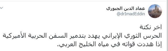 وكتب الجبوري عبر تغريدة له على "تويتر" رصدها " المشهد العربي":"أخر نكتة،الحرس الثوري الإيراني يهدد بتدمير السفن الحربية الأميركية إذا هددت قواته في مياه الخليج العربي".
