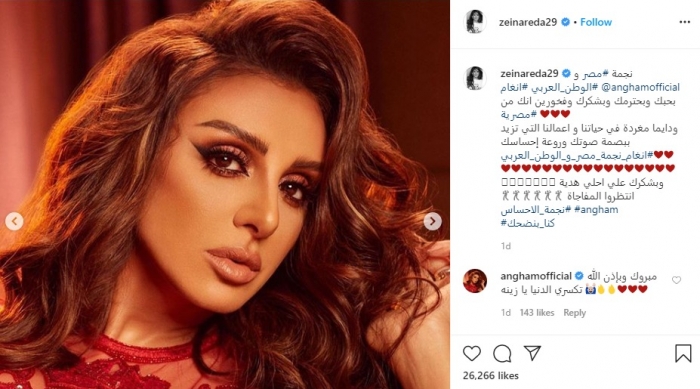 ونشرت زينة، صورا لأنغام عبر حسابها على إنستجرام، وعلقت: "نجمة مصر والوطن العربي.. أنغام، بحبك وبحترمك وبشكرك، فخورين إنك مصرية، ودايما مغردة في حياتنا وأعمالنا التي تزيد ببصمة صوتك وجمال إحساسك، بشكرك على أحلى هدية.. انتظروا المفاجأة".