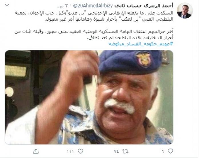 وكتب "الربيزي" في تغريدة عبر حسابه بتويتر، رصدها "المشهد العربي" قال فيها: "السكوت على ما يفعله الإرهابي الإخونجي "بن عديو" وكيل حزب الإخوان، بمعية البلطجي الغبي "بن لعكب" بأحرار شبوة وهاماتها أمر غير مقبول".