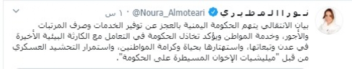 وكتبت "المطيري"، في تغريدة عبر تويتر، رصدها "المشهد العربي": "بيان الانتقالي يتهم الحكومة اليمنية بالعجز عن توفير الخدمات وصرف المرتبات والأجور، وخدمة المواطن ويؤكد تخاذل الحكومة في التعامل مع الكارثة البيئية الأخيرة في عدن وتبعاتها، واستهتارها بحياة وكرامة المواطنين، واستمرار التحشيد العسكري من قبل "ميليشيات الإخوان المسيطرة على الحكومة".