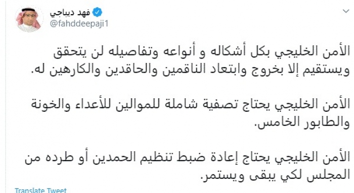 وأضاف: "الأمن الخليجي يحتاج تصفية شاملة للموالين للأعداء والخونة والطابور الخامس. الأمن الخليجي يحتاج إعادة ضبط تنظيم الحمدين أو طرده من المجلس لكي يبقى ويستمر".