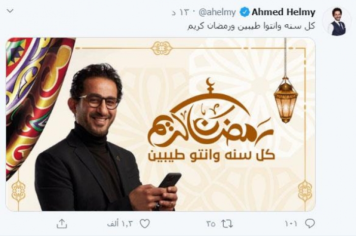 هنأ الفنان أحمد حلمي، جمهوره ومتابعيه بحلول شهر رمضان المبارك، من خلال حسابه الرسمي بموقع "تويتر".